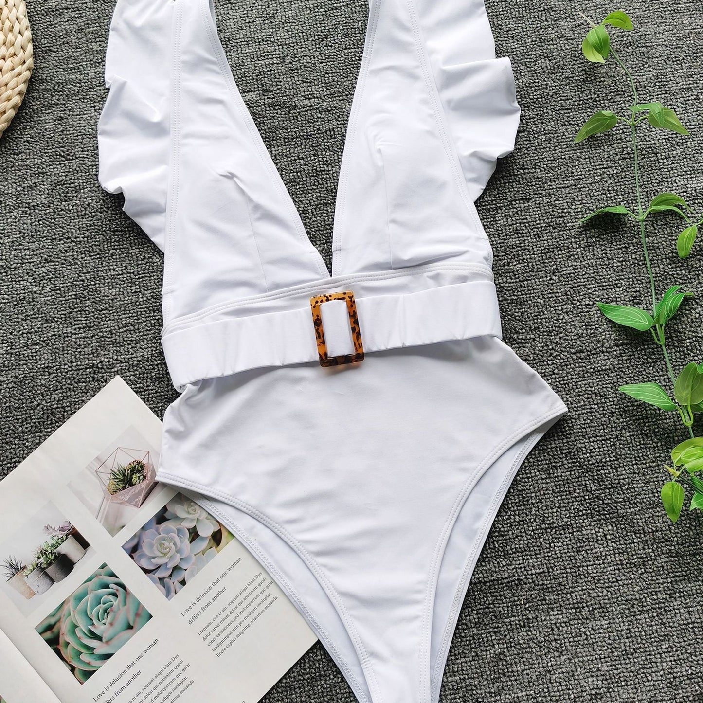 Deep V Neck Ruffled and Buckled One Piece Swimsuit
