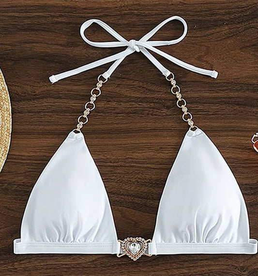 White Sexy Crystal Chain Micro Thong String Halter High Cut Triangle Top Bathing Suit